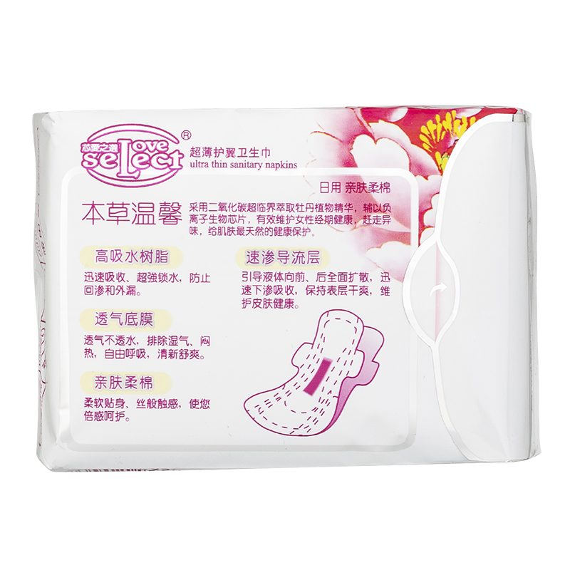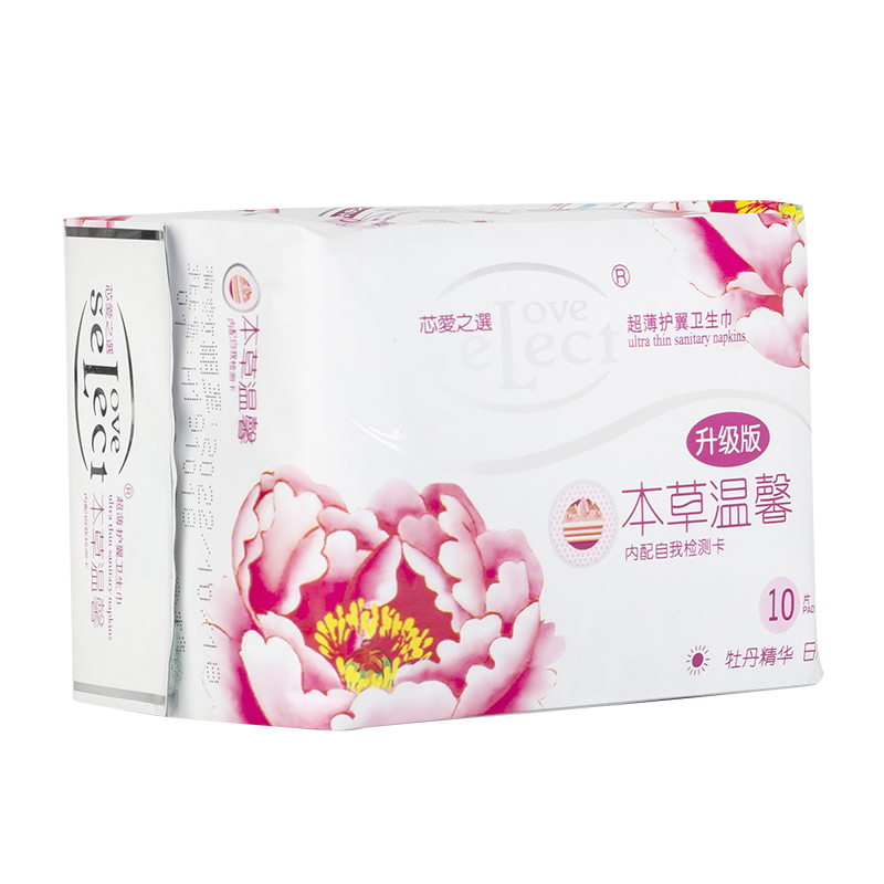 芯愛之選负离子卫生巾牡丹精华款采用二氧化碳超临界萃取牡丹植物精华,辅以负离子生物芯片,促进生物酶氧化,达到完美融合,清爽舒适,富贵芳香。