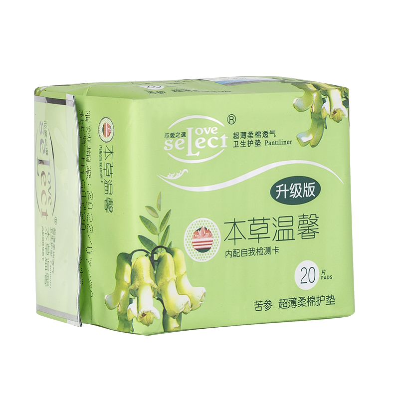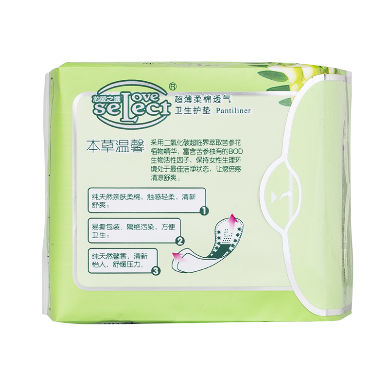芯愛之選负离子卫生护垫采用二氧化碳超临界萃取苦参花植物精华,富含苦参独有的BOD生物活性因子,保持女性生理环境处于最佳洁净状态,留下淡淡的清香和清凉感受,让你倍感舒适和清爽。
